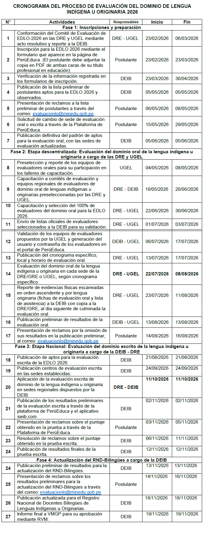 Para la Evaluación de Dominio de Lengua Indígena u Originaria - EDLO 2026, debe tomar en cuenta lo siguiente: